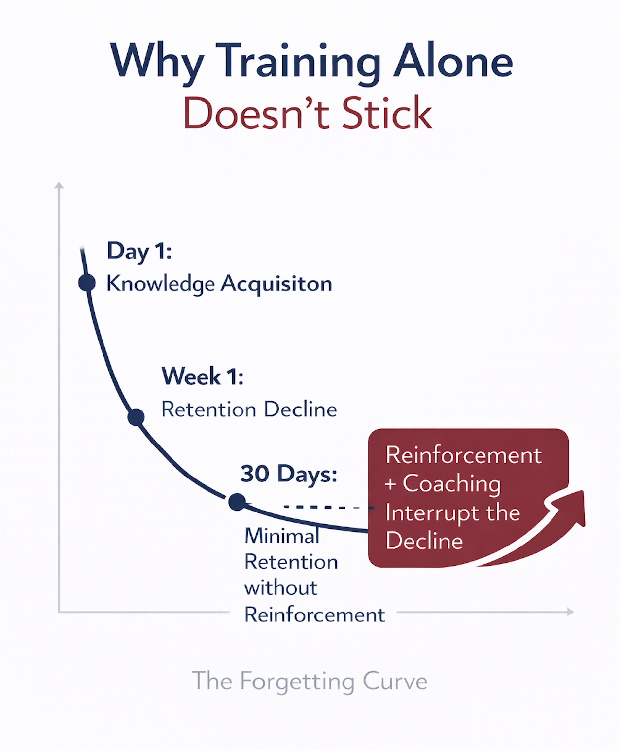 The Forgetting Curve describes how retention drops after learning unless information is reinforced. For partner teams, this means training can fade quickly without coaching, applied practice, and role-based reinforcement tied to real work.